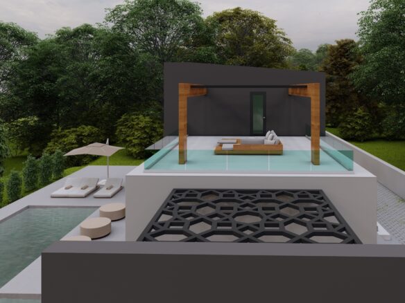 In brief, it is a 120m2 house, 3 bedrooms, 3 bathrooms, storage room, 1 guest toilet, kitchen with cabinets, living room, 200m2 outdoor tiled area, 30m2 open air parking place, ground level lounge area with pergola, pathway to the house & 35m2 modern design pool.