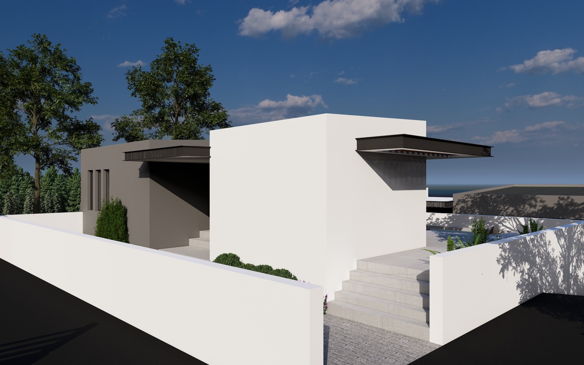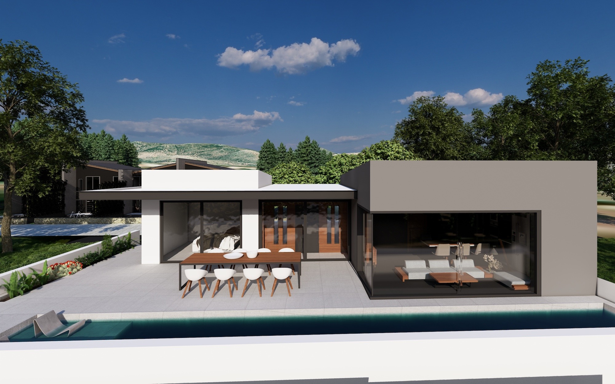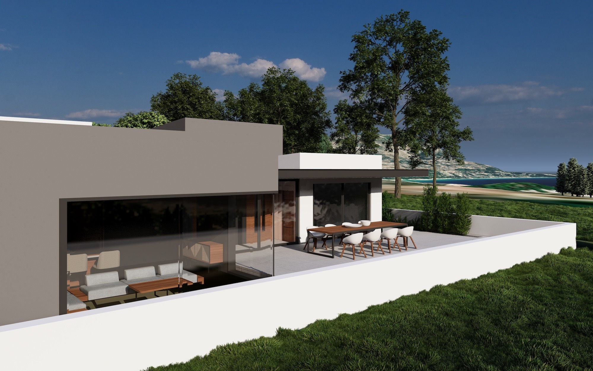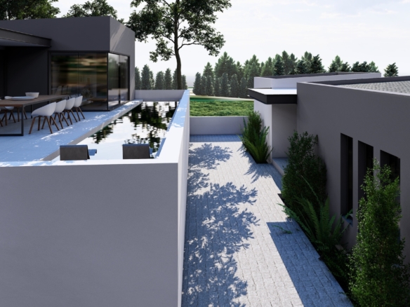 The house is designed as energy efficient with a special thermal cell. It will have air condition in every room and a modern designed living room.